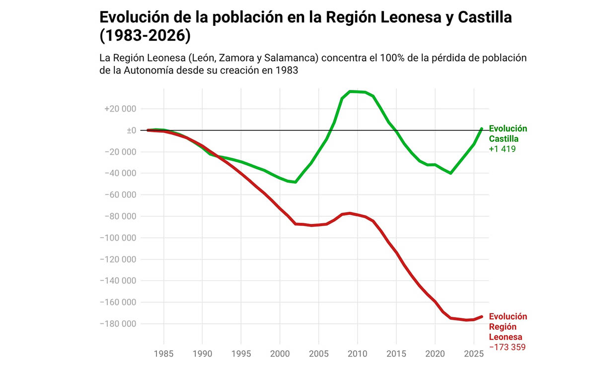 La despoblación en la Región Leonesa vuelve al centro del debate político y social. El Colectivo Ciudadanos de la Región Leonesa (CCRL) sostiene que León, Zamora y Salamanca acumulan un descenso de 173.359 habitantes desde la creación de Castilla y León, mientras las provincias castellanas registrarían un ligero crecimiento de 1.419 en el mismo periodo.