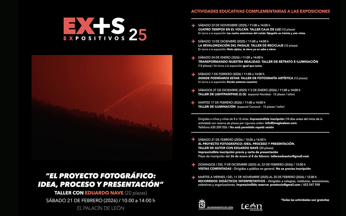 El Palacín de León amplía la programación paralela de la muestra ‘Expositivos 25’ con un taller de autor a cargo de Eduardo Nave, fotógrafo de reconocida trayectoria cuya obra puede verse actualmente en este espacio cultural. La actividad, titulada ‘El proyecto fotográfico: idea, proceso y presentación’, se celebrará el sábado 21 de febrero de 2026, en horario de 10:00 a 14:00 horas.
