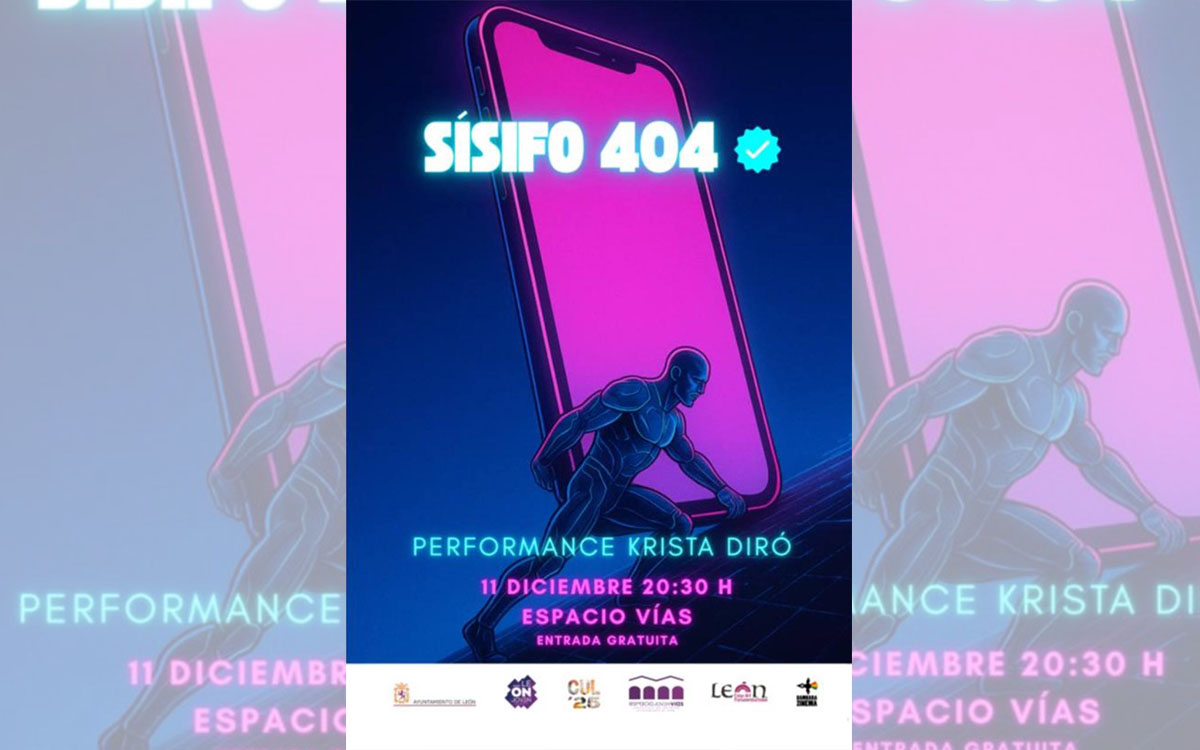 La performance Sísifo 404 en Espacio Vías León se presenta el jueves 11 de diciembre de 2025, a partir de las 20:30 horas, en el espacio cultural Espacio Vías de la capital leonesa. La cita, con entrada libre hasta completar aforo, está firmada por la artista Krista Diró y ha sido seleccionada en la convocatoria cultural CUL’25 de la Concejalía de Juventud del Ayuntamiento de León, dirigida a impulsar proyectos originales de artes visuales, audiovisuales y en vivo con participación activa del público joven.