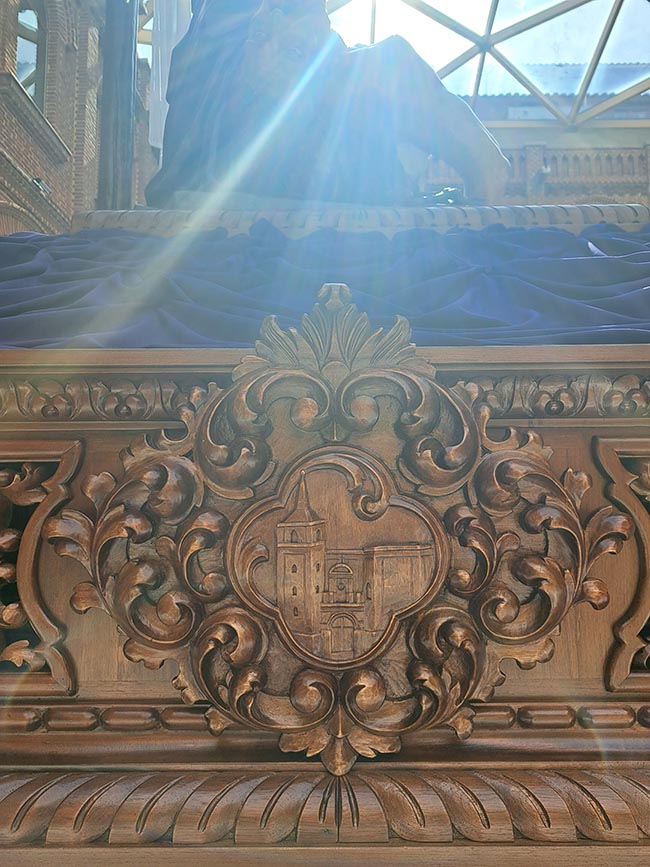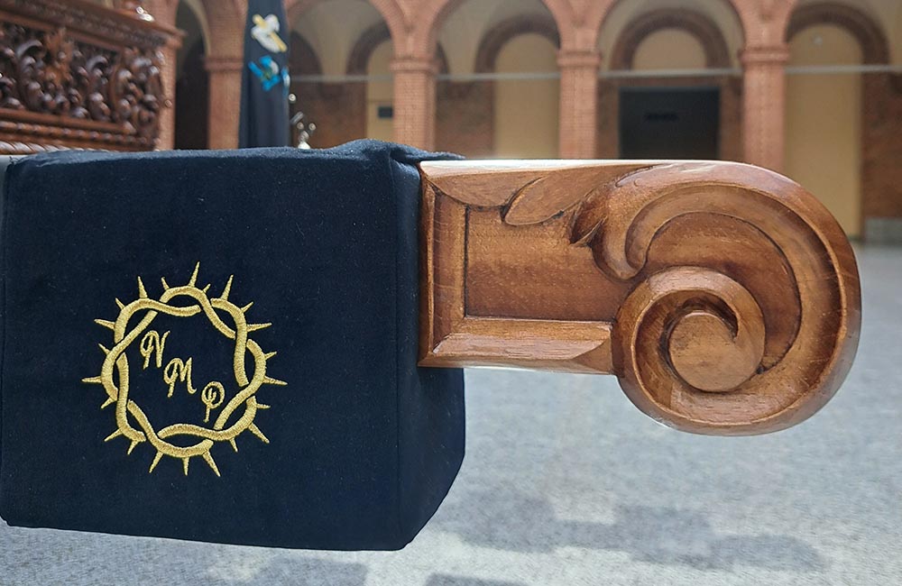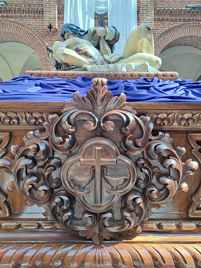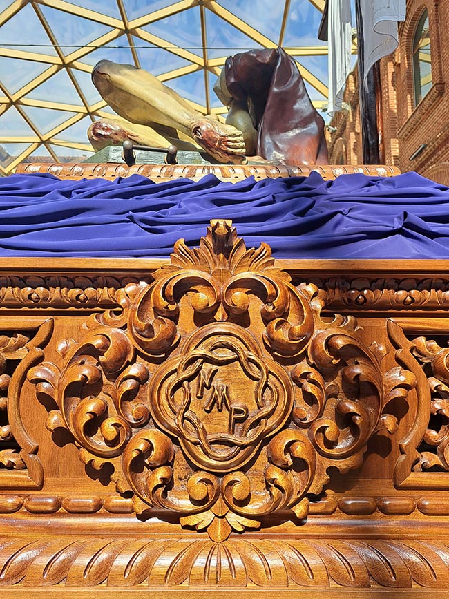 El trono presenta también una peana tallada para colocar la imagen a la hora de procesionar, puntas de varas en madera, esquinas coronadas por hachones y una cruz nueva más ligera donde, a modo de cápsula del tiempo, se ha introducido el libro de Braceras de Nuestra Madre de la Piedad.