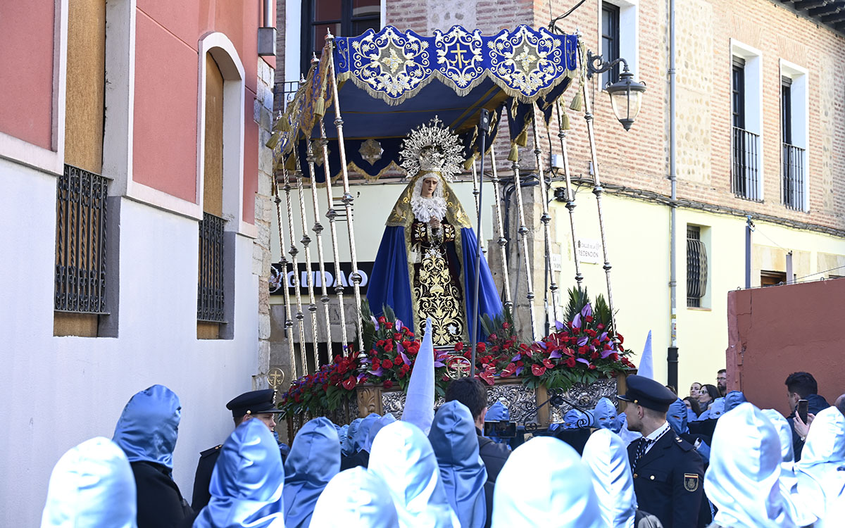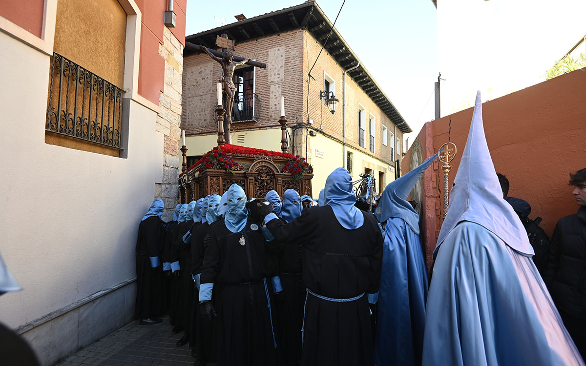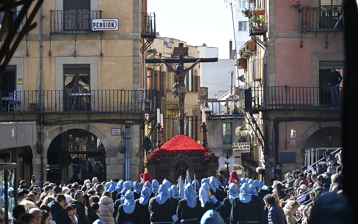 La salida se ha producido a las 08:45 desde el entorno de San Claudio, con un itinerario oficial que ha pasado por puntos tan señalados como Antonio Valbuena, la Plaza de Santa María del Camino, la Plaza Mayor y Mariano Domínguez Berrueta. Además, la procesión ha incluido las ofrendas florales en la Iglesia de San Claudio, en la capilla del Cristo de Fuera de San Martín y en el convento de las RR.MM. Concepcionistas, antes de regresar a El Albéitar.