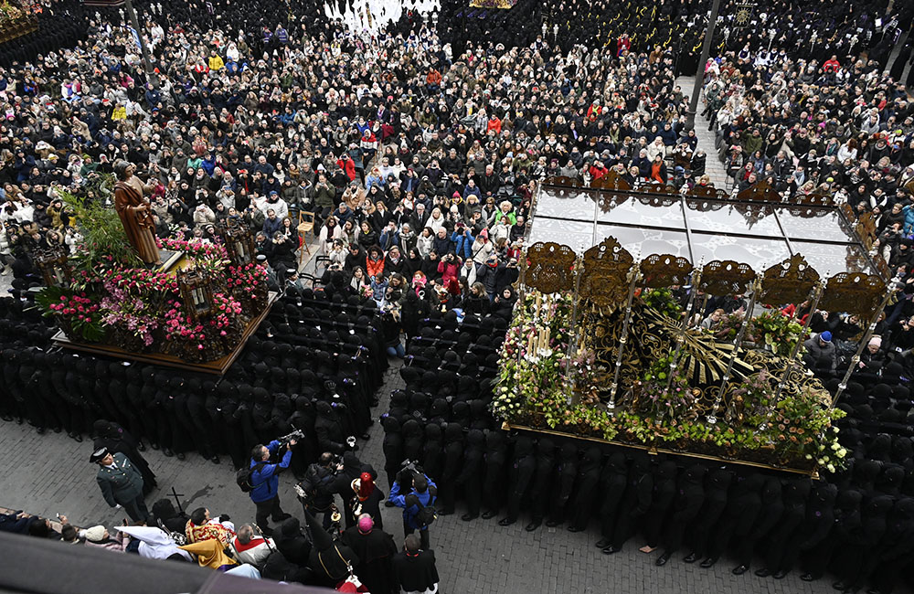 Con escrupulosa puntualidad, la comitiva partía desde la Iglesia de Santa Nonia camino a la Plaza Mayor, lugar donde miles de espectadores esperaban volver a disfrutar del acto de ‘El Encuentro’ entre San Juan y Madre Dolorosa.