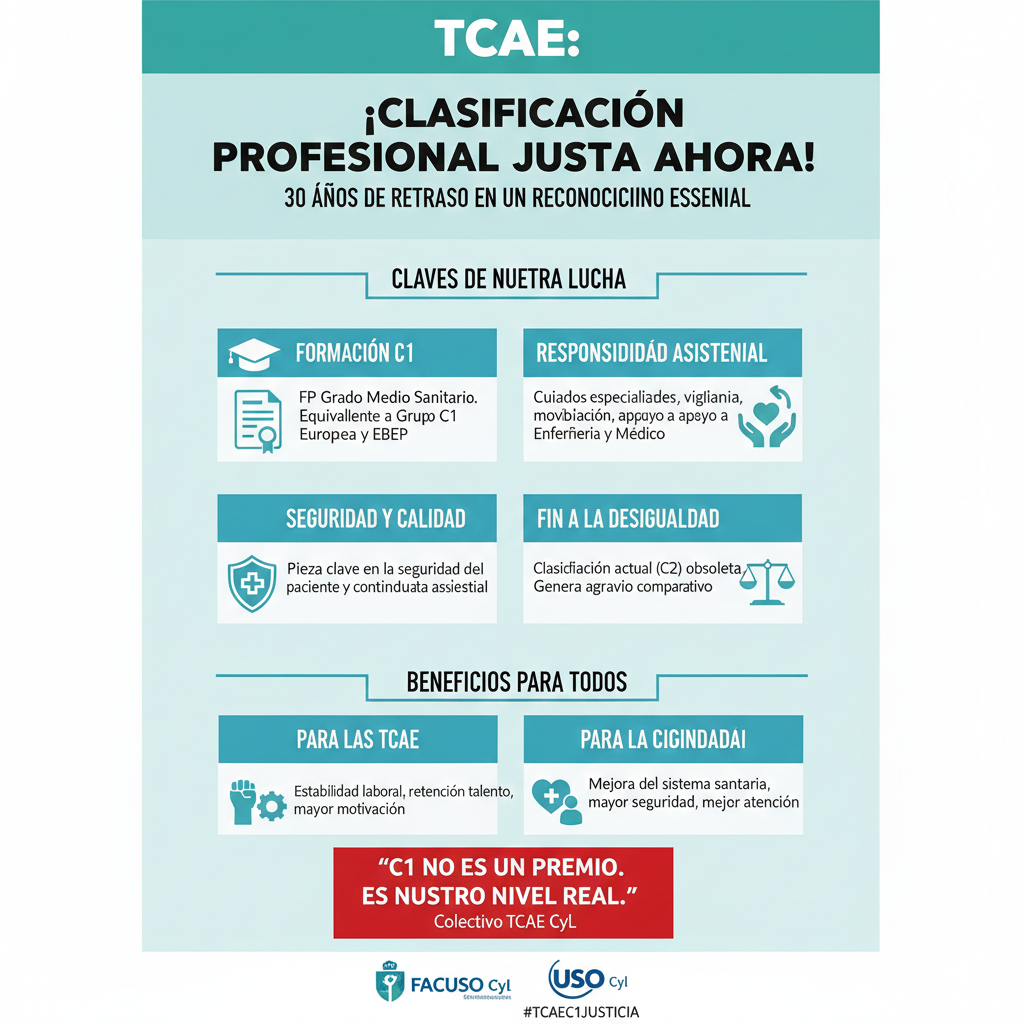 «C1 no es un premio. Es nuestro nivel real. Es justicia», afirman las TCAE, apelando a la Junta de Castilla y León y a todas las administraciones públicas para que pongan fin a este «retraso de treinta años en la actualización profesional» y armonicen su clasificación con la legislación educativa y las funciones que realmente desempeñan.