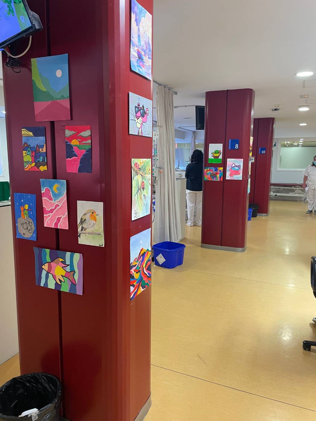 El Hospital de Día Oncohematológico del Hospital Universitario de León cuenta desde este lunes con una imagen más alegre, gracias a los alumnos del taller de pintura del ayuntamiento de Villaquilambre, con edades comprendidas entre los 5 y los 17 años, cuyos dibujos decoran la sala de tratamientos aportando color a este espacio.